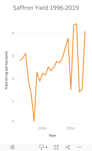The initial two years of the Mission saw no improvement in saffron production, data show, but it increased in 2012 and 2013 and declined in 2014 due to floods.